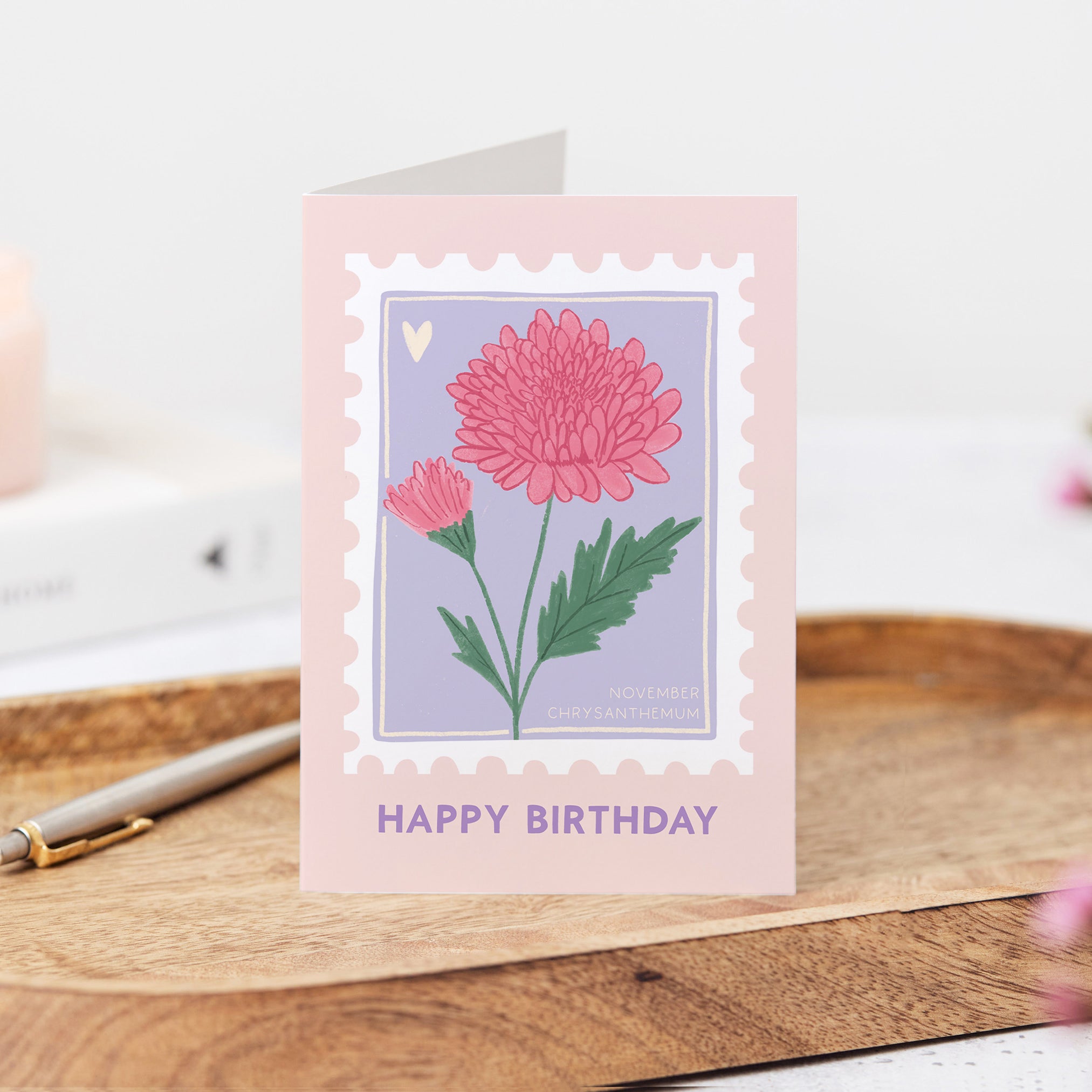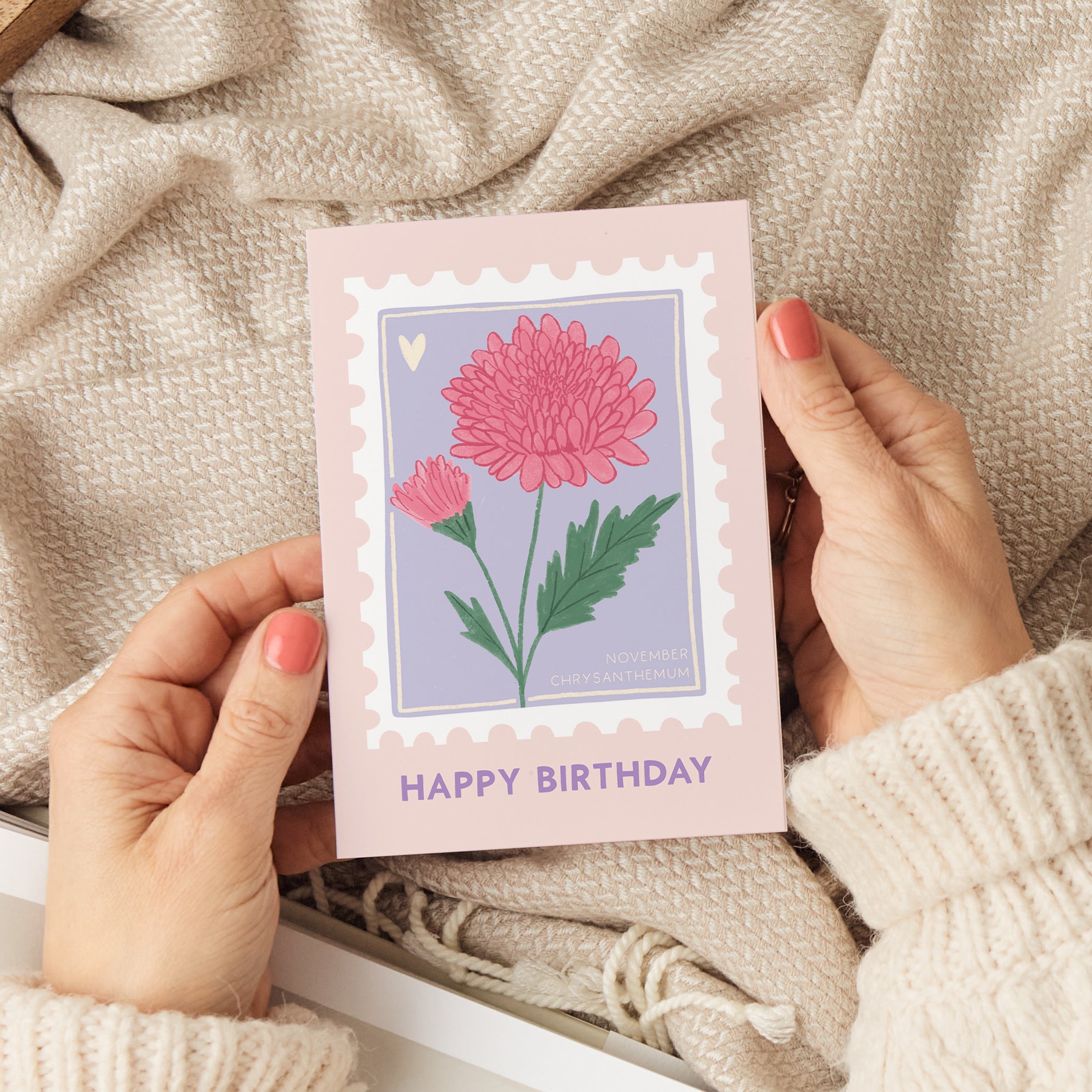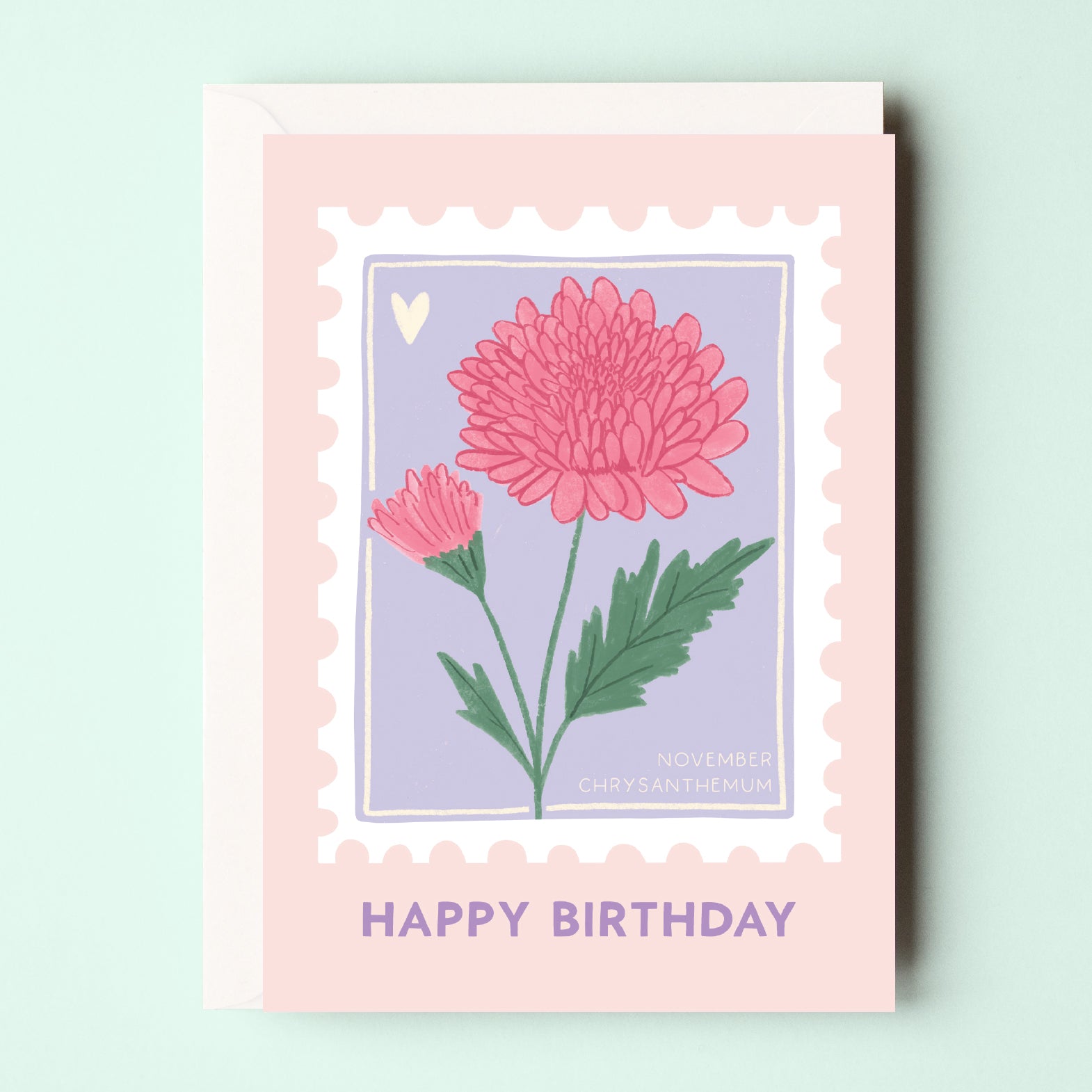 November's birthday card features a pink chrysanthemum in a vintage stamp design. Chrysanthemum's symbolise joy and friendship. The perfect card for someone with a birthday in November!
