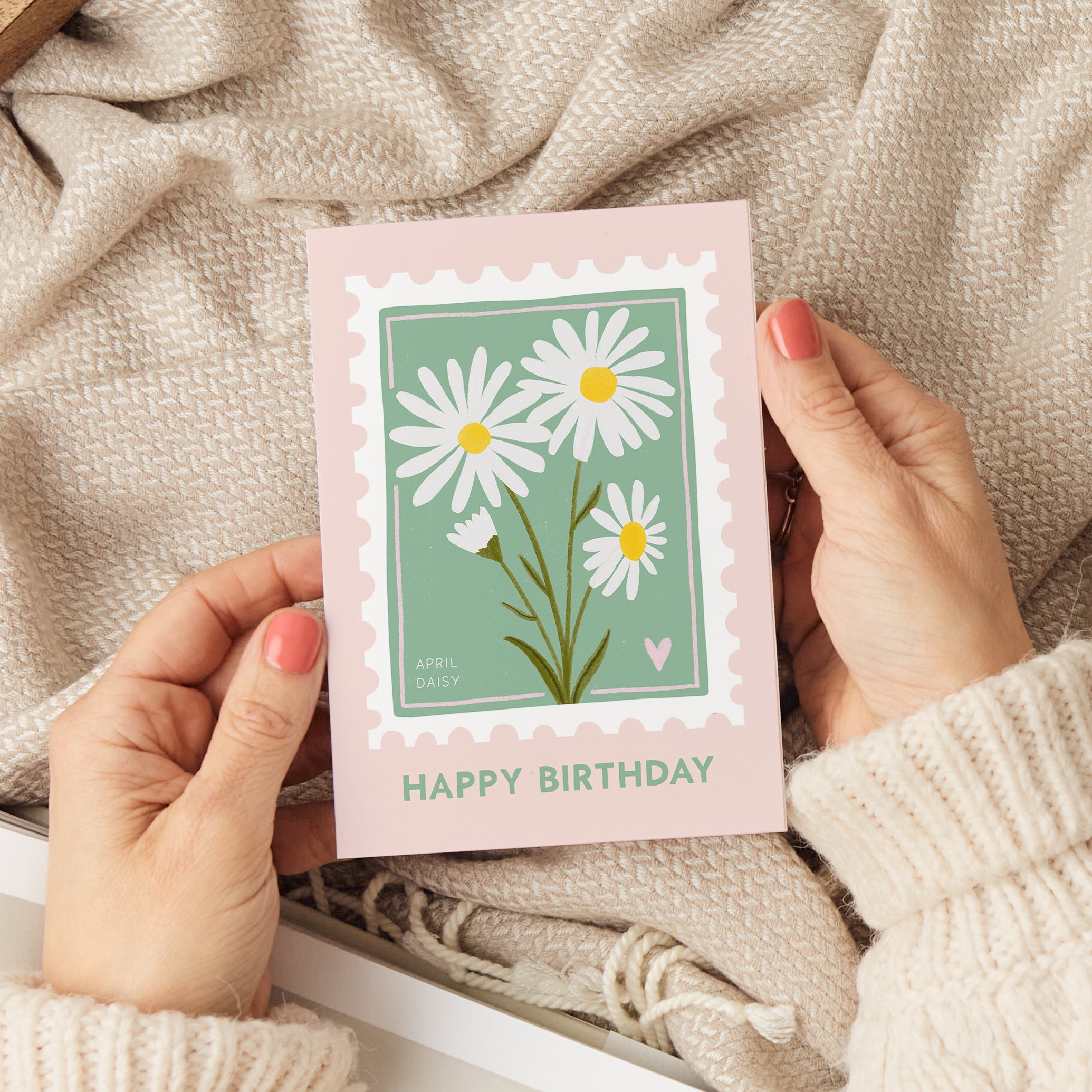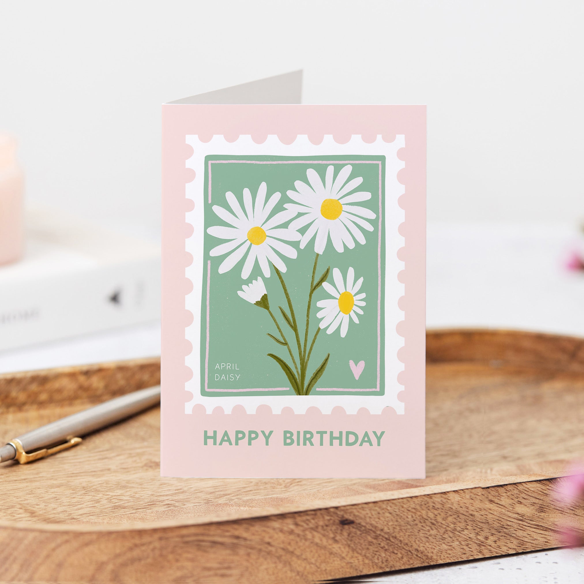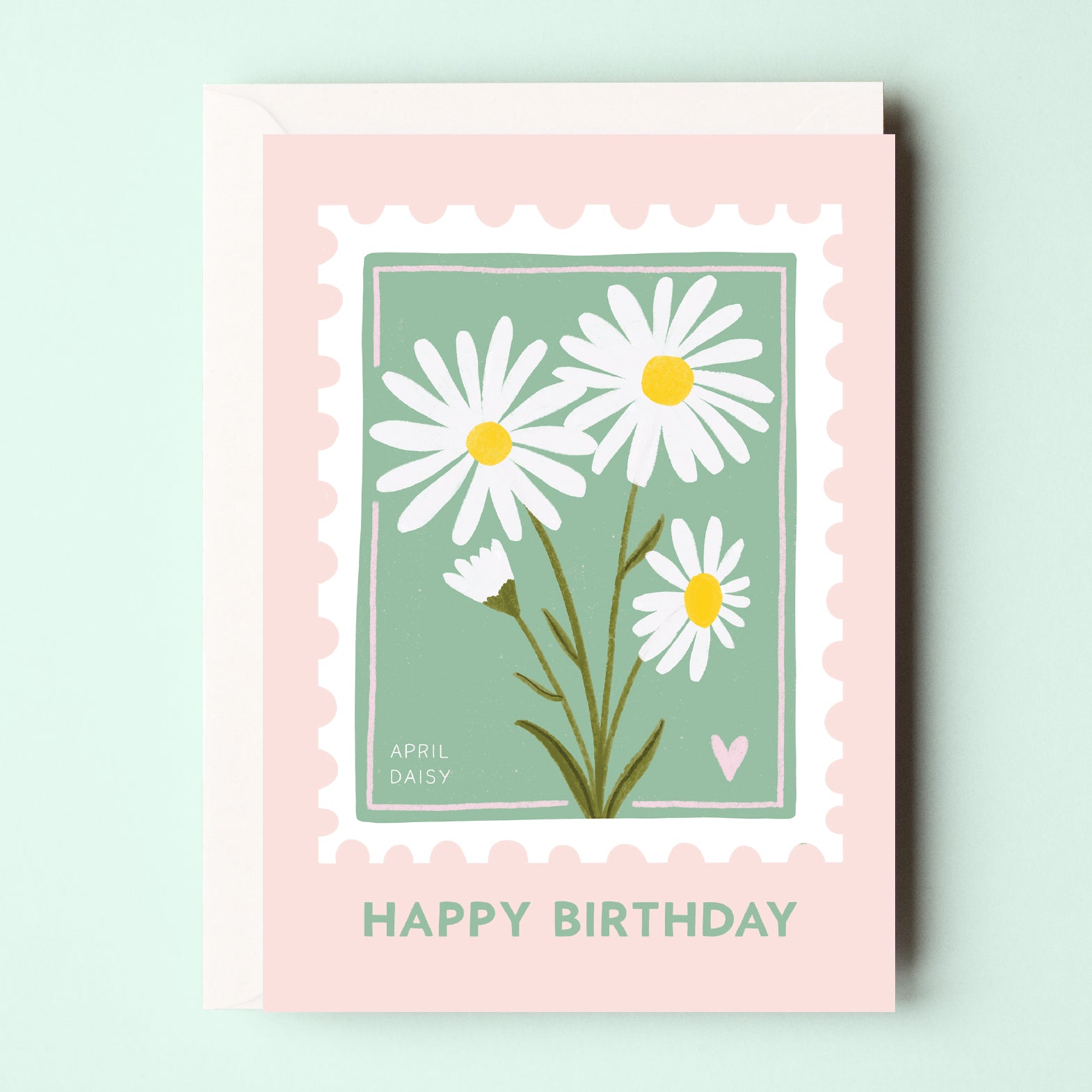 April's birthday card features gorgeous daisies in a vintage stamp design. Daisies symbolise innocence, purity and new beginnings. The perfect card for anyone with a birthday in April!