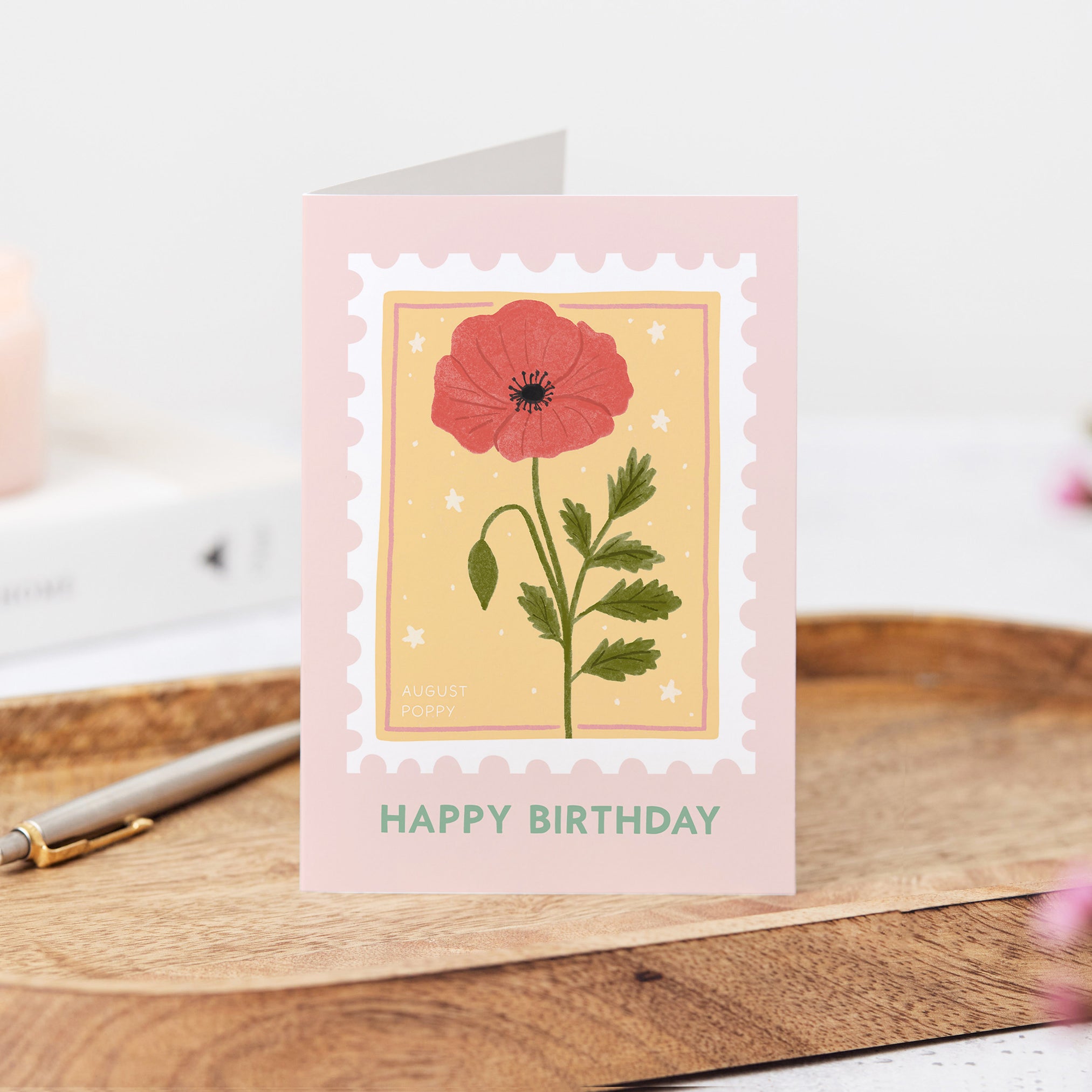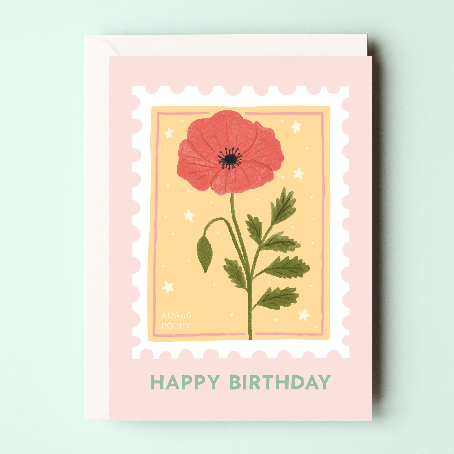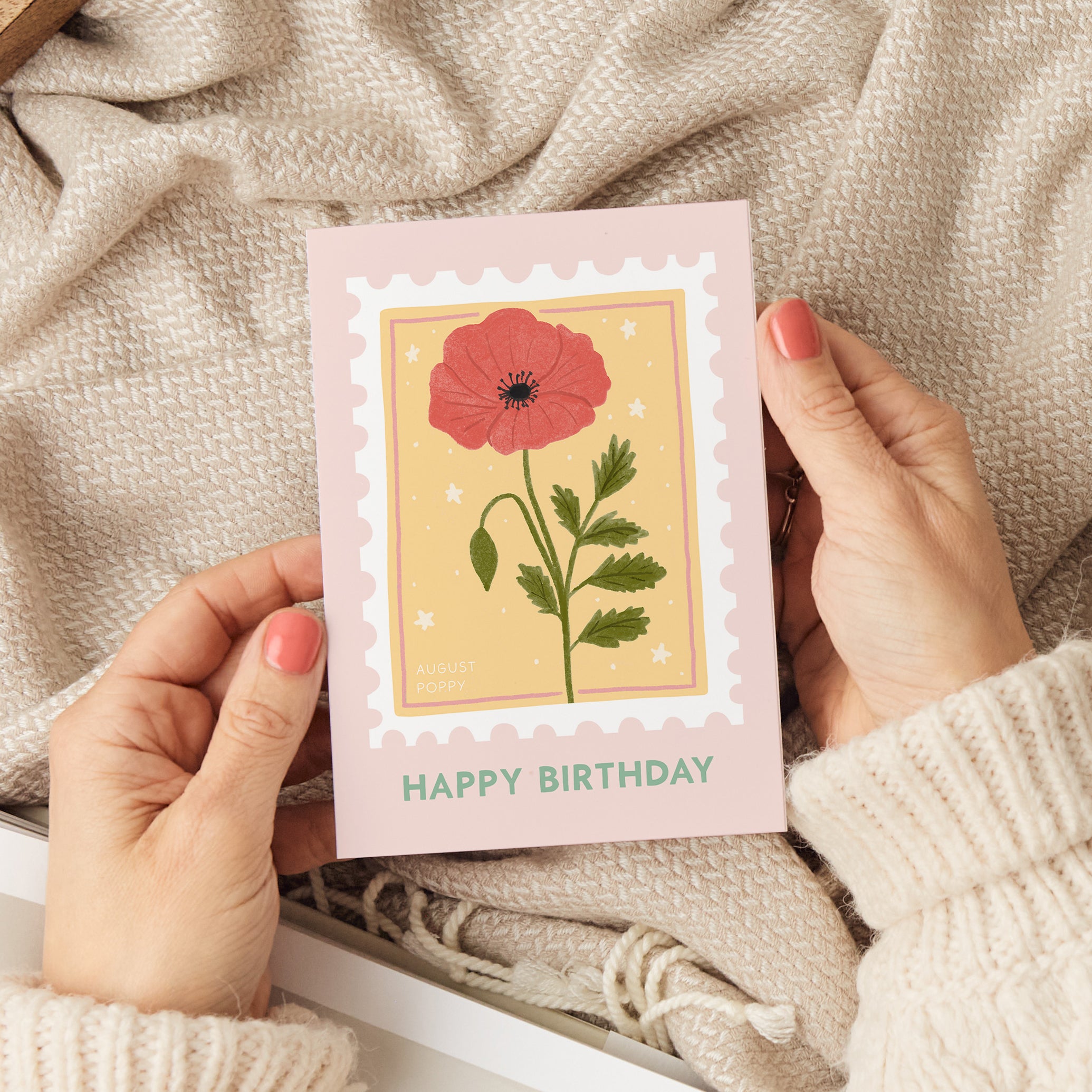 August's birthday card features a delicate red poppy in a vintage stamp design. Poppies symbolise strength and imagination. The perfect card for someone with a birthday in August!