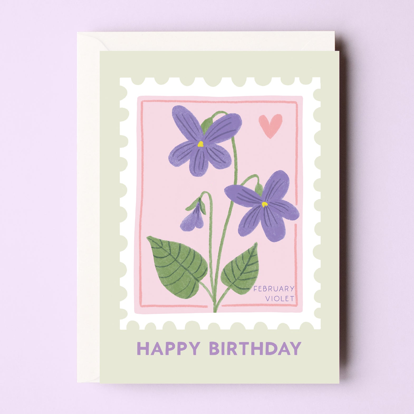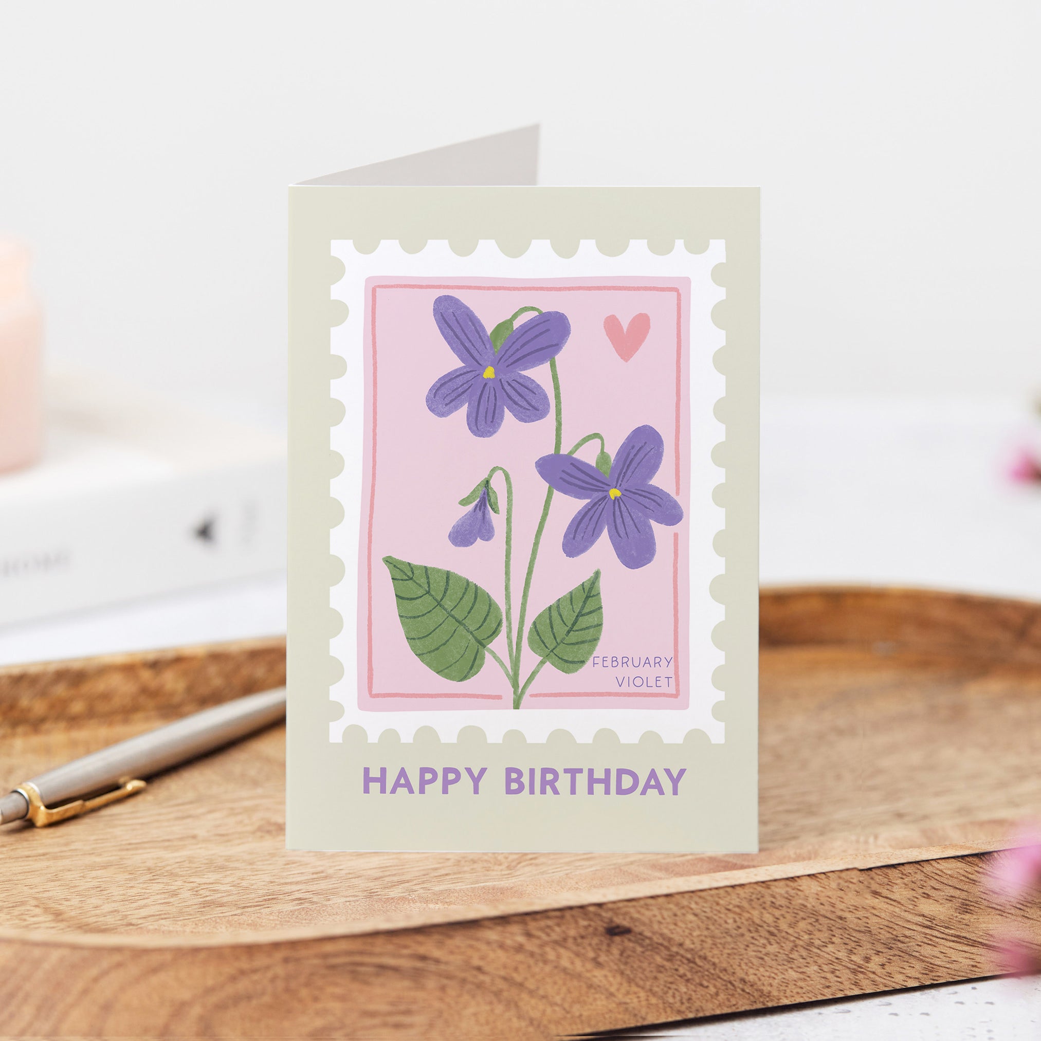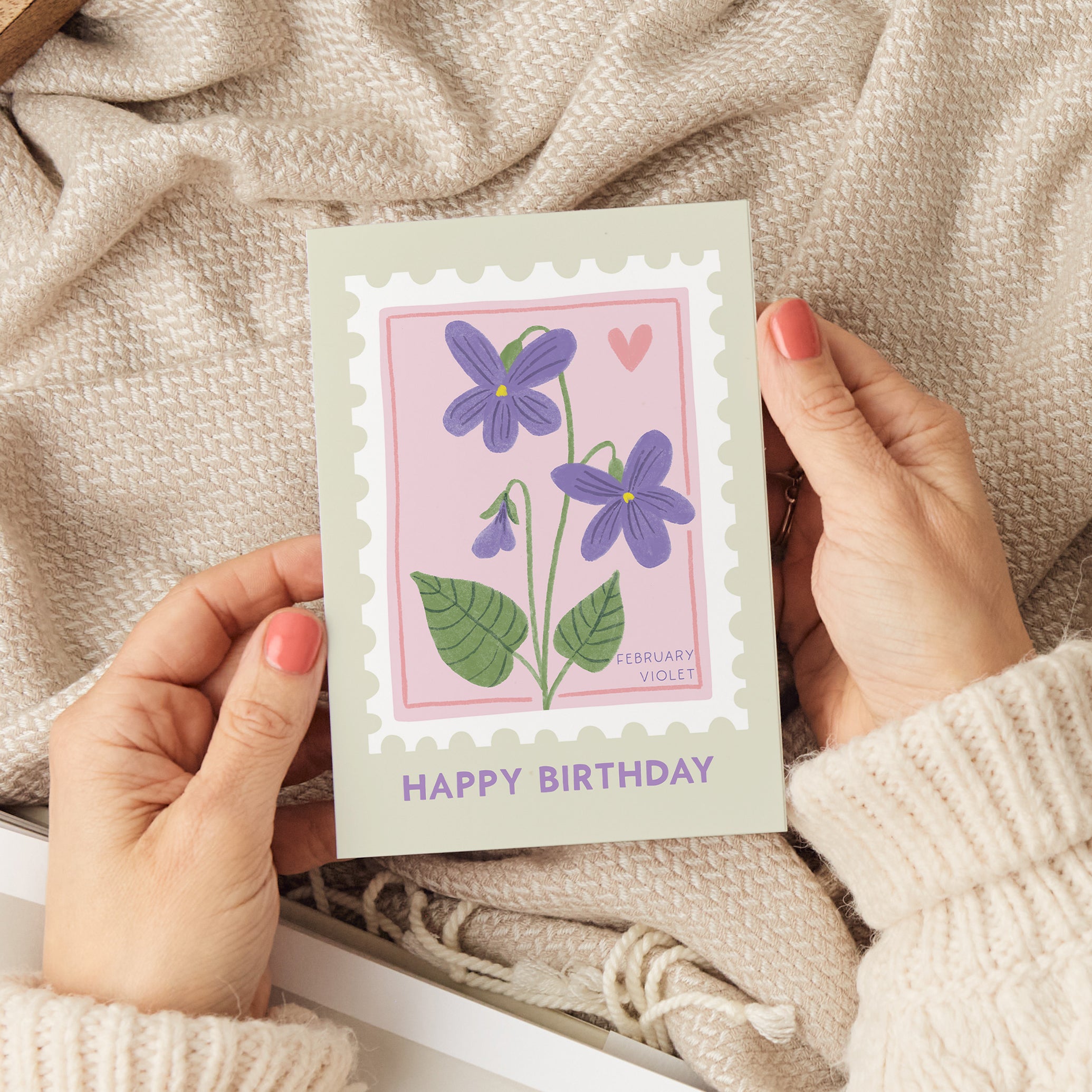 February's birthday card features a beautiful violet in a vintage stamp design. Violets symbolise modesty, faithfulness and spiritual wisdom. The perfect card for someone with a birthday in February!