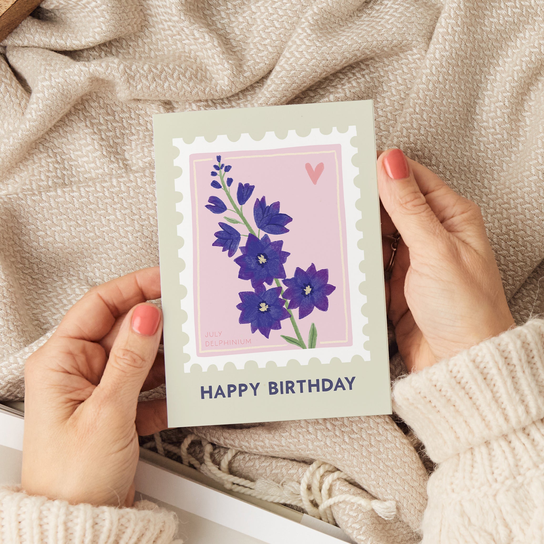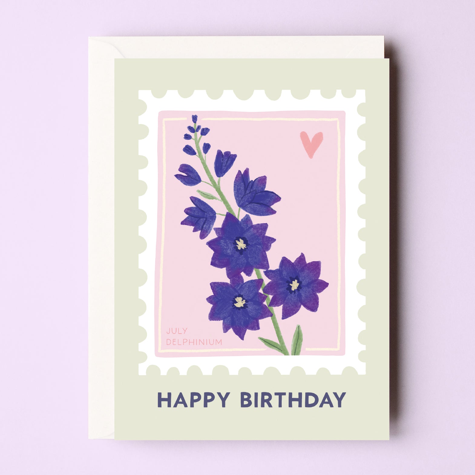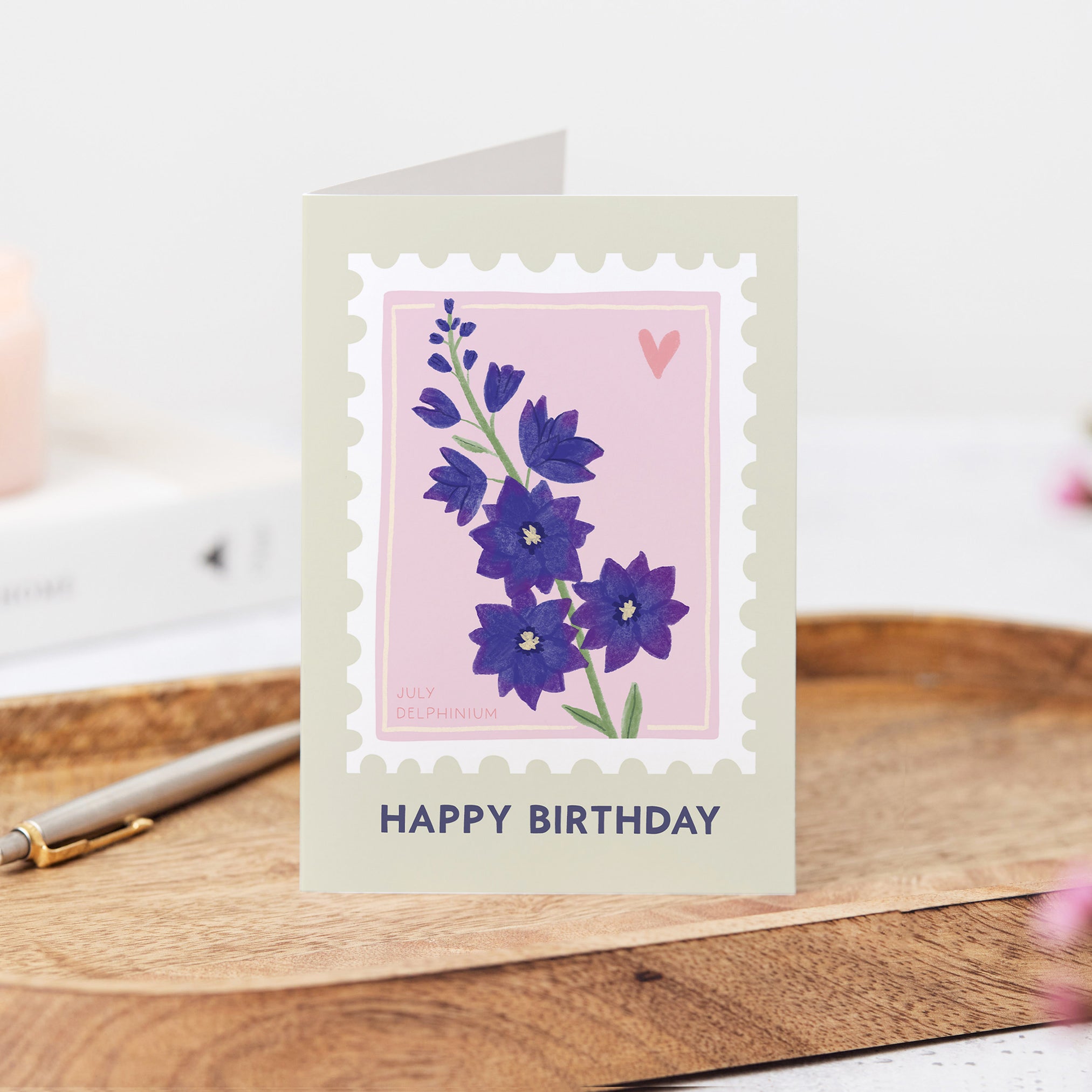 July's birthday card features a blue delphinium (also known as larkspur) in a vintage stamp design. Delphiniums symbolise positivity and grace. The perfect card for someone with a birthday in July!