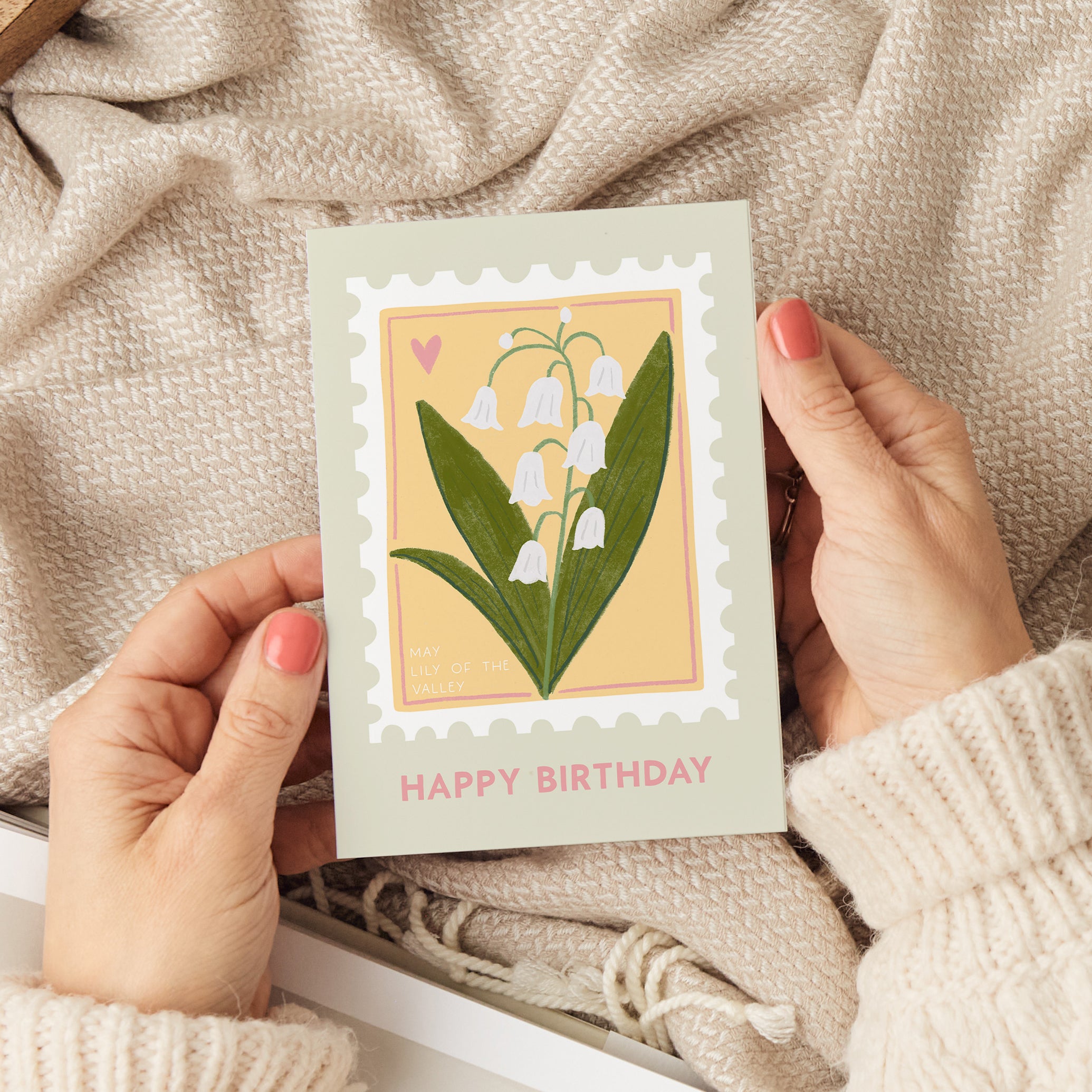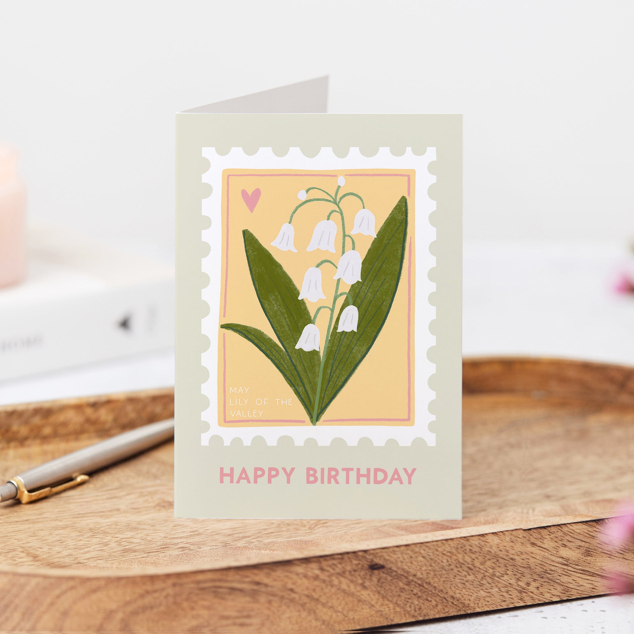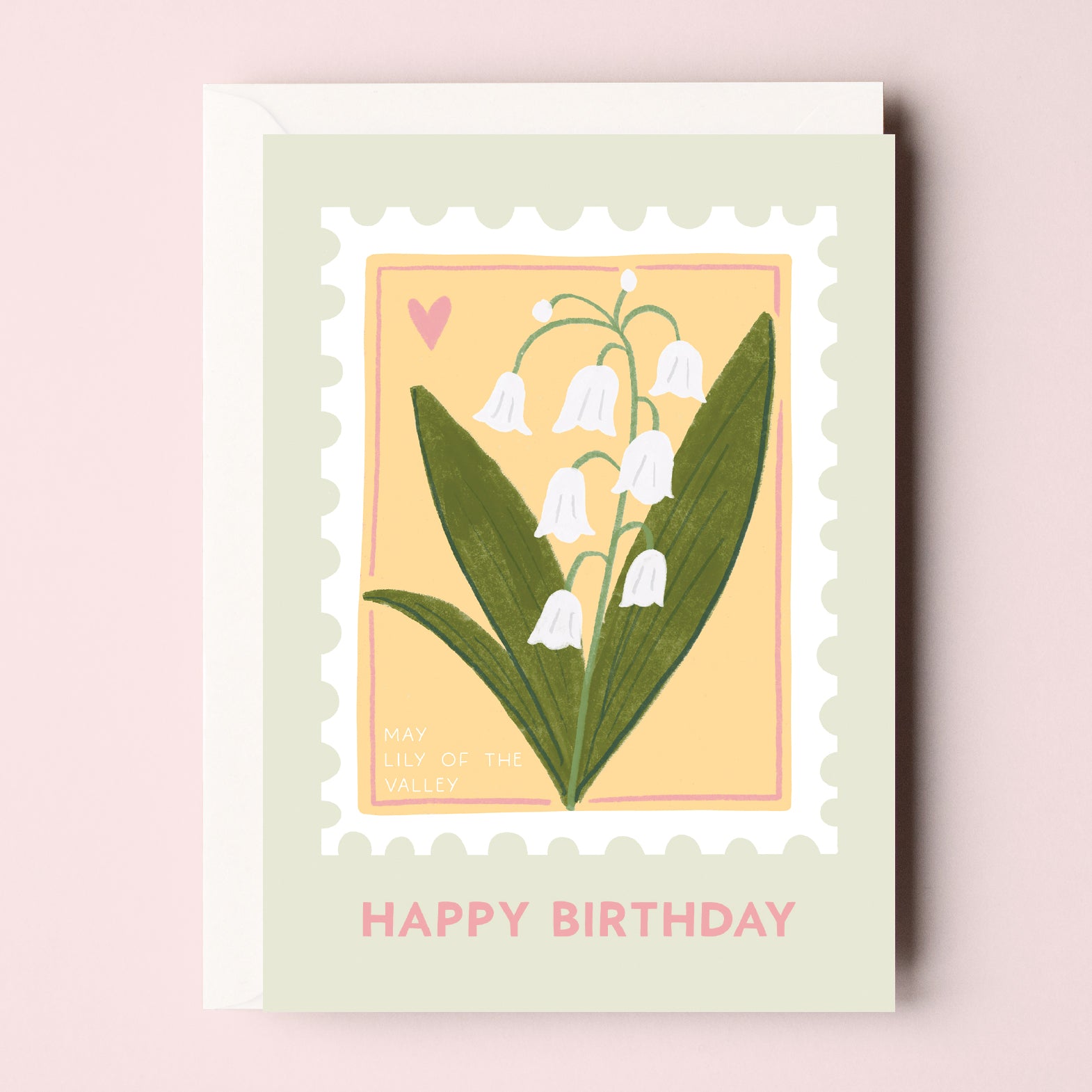 May's birthday card features an elegant lily of the valley in a vintage stamp design. Lily of the Valley symbolise sensitivity and grace. The perfect card for someone with a birthday in May!