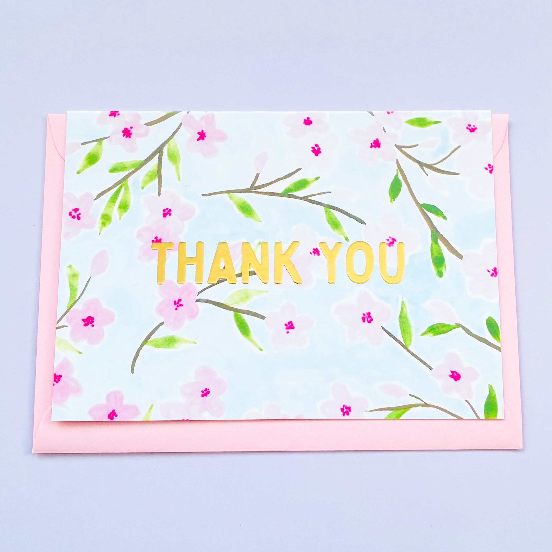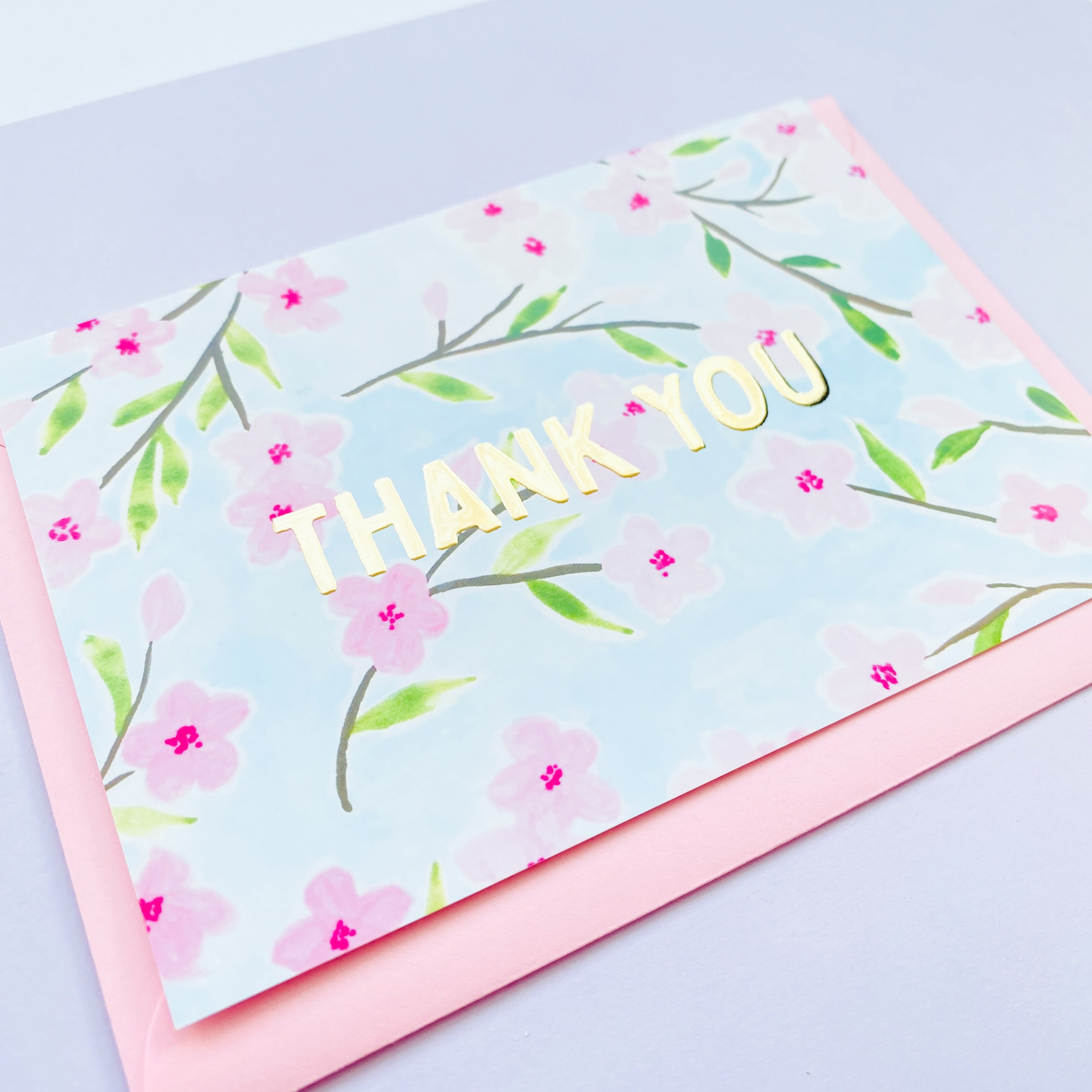 Watercolour cherry blossoms decorate this gold foil thank you card.