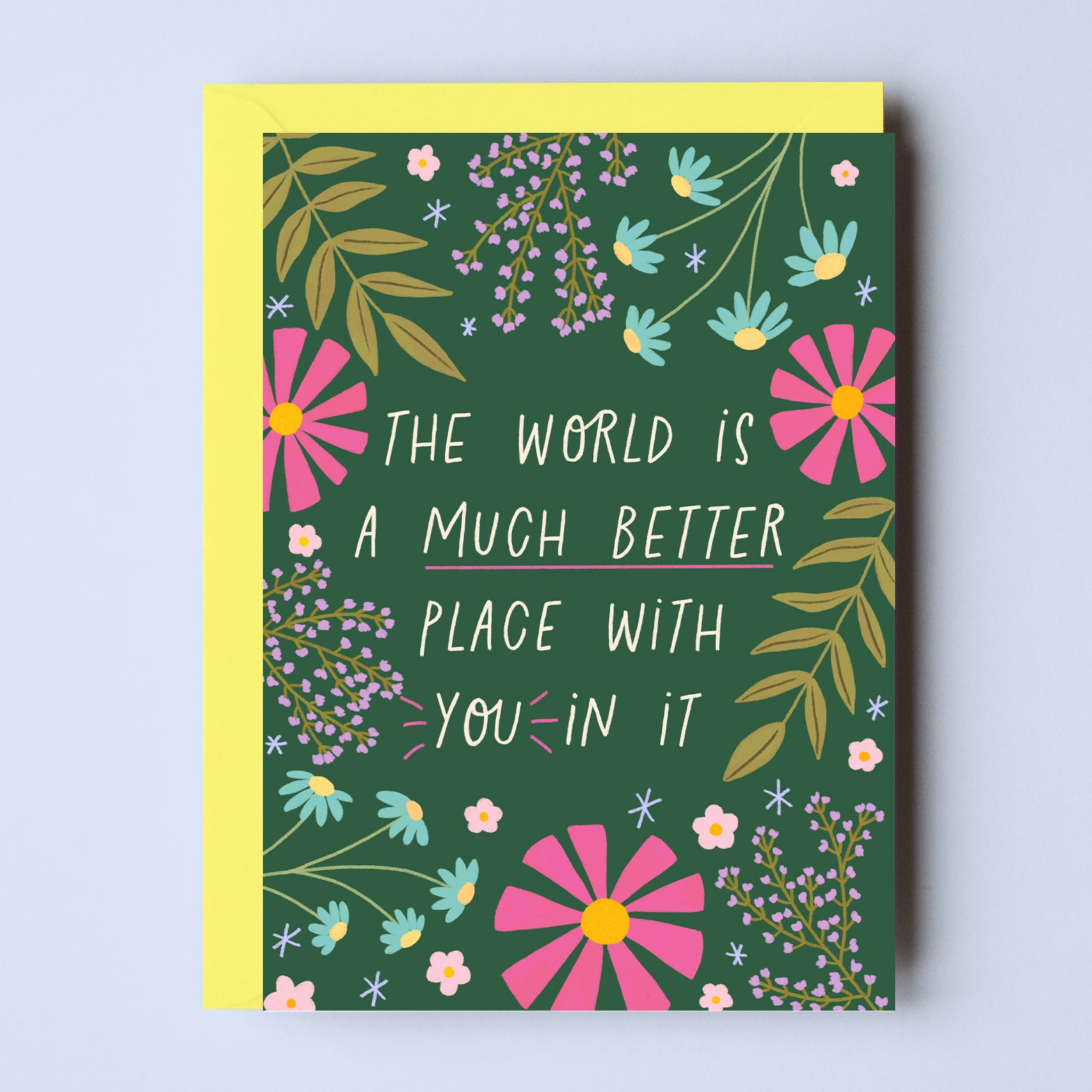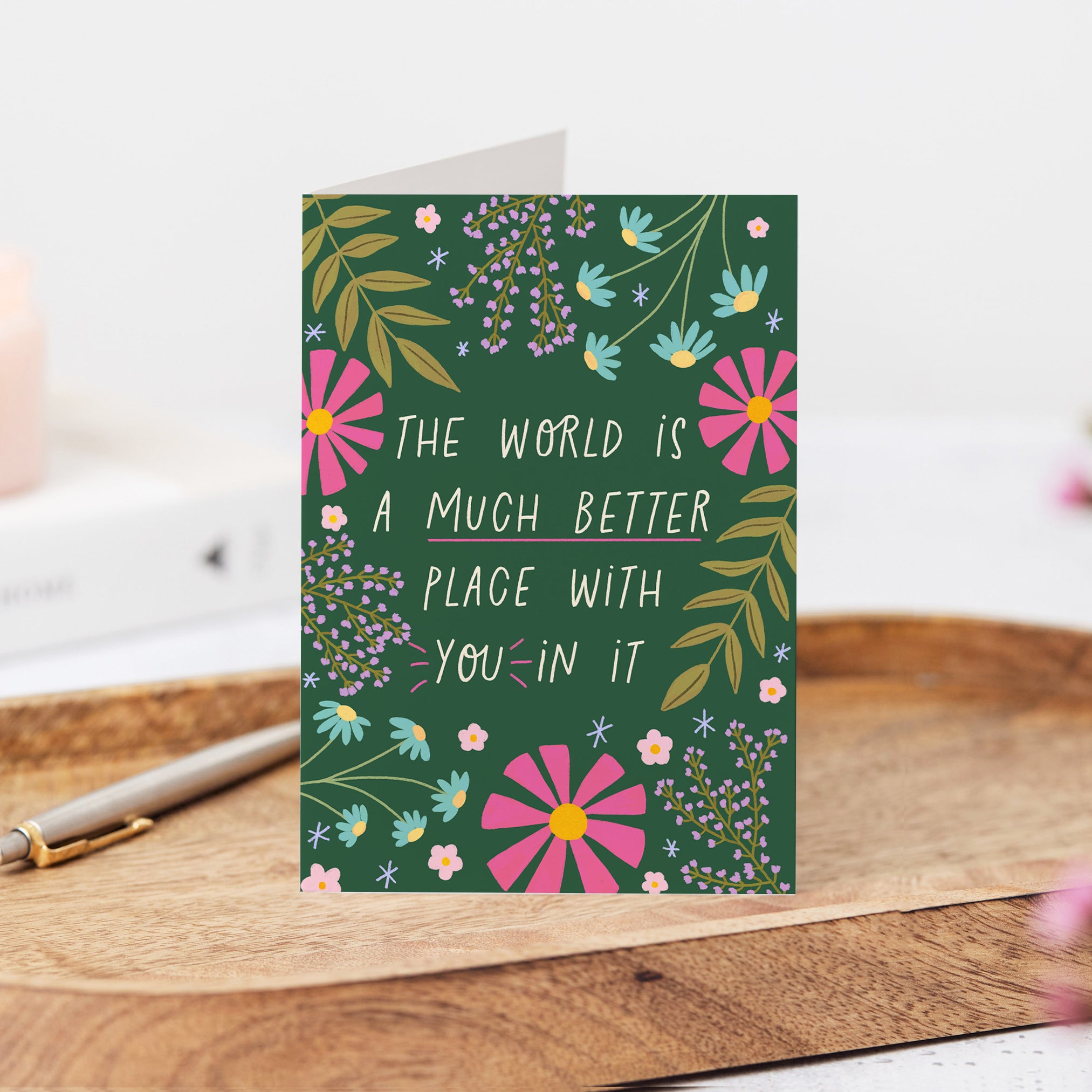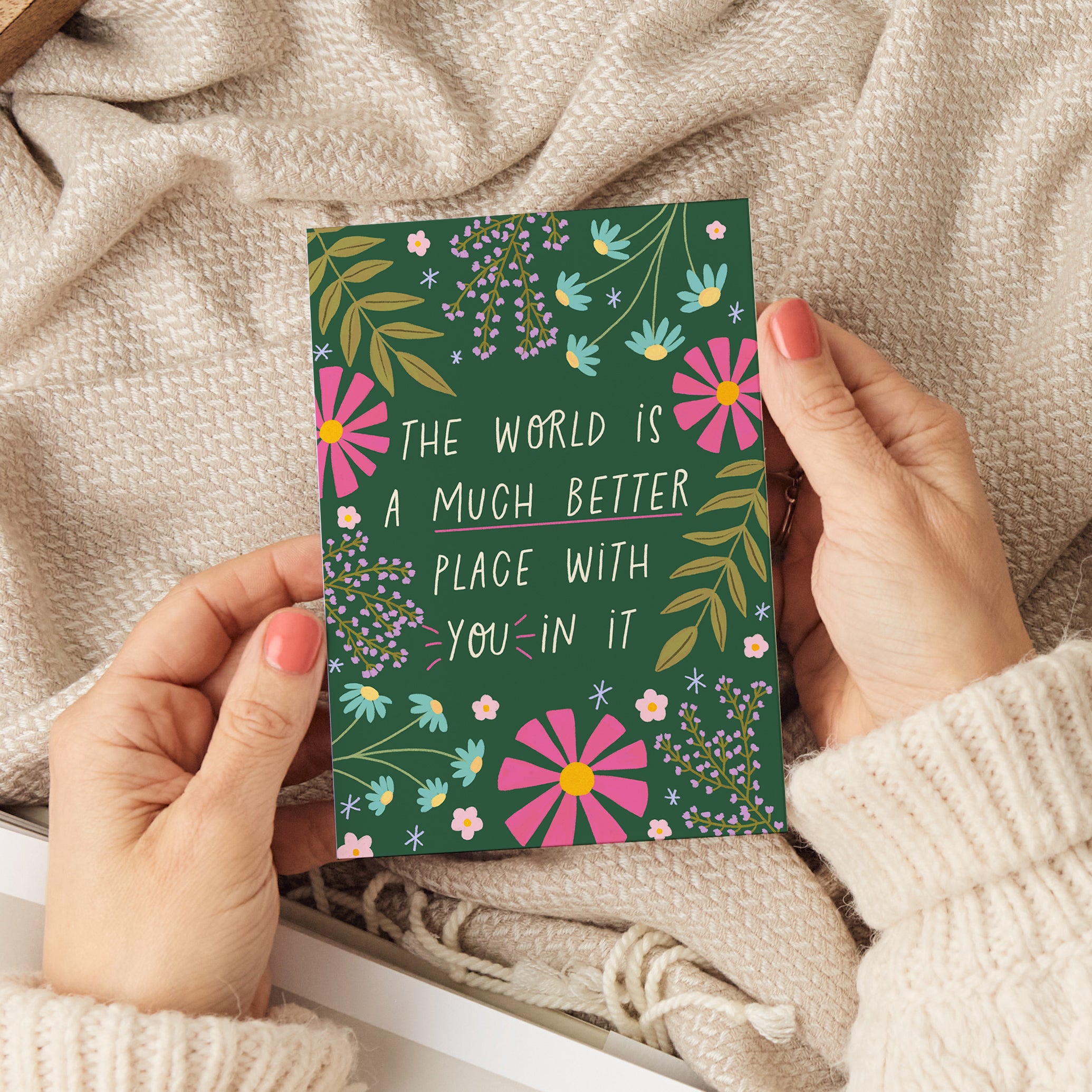A heartfelt card for someone in need of a pick me up, this card is hand illustrated with pretty florals and features the quote 'The world is a much better place with you in it.'