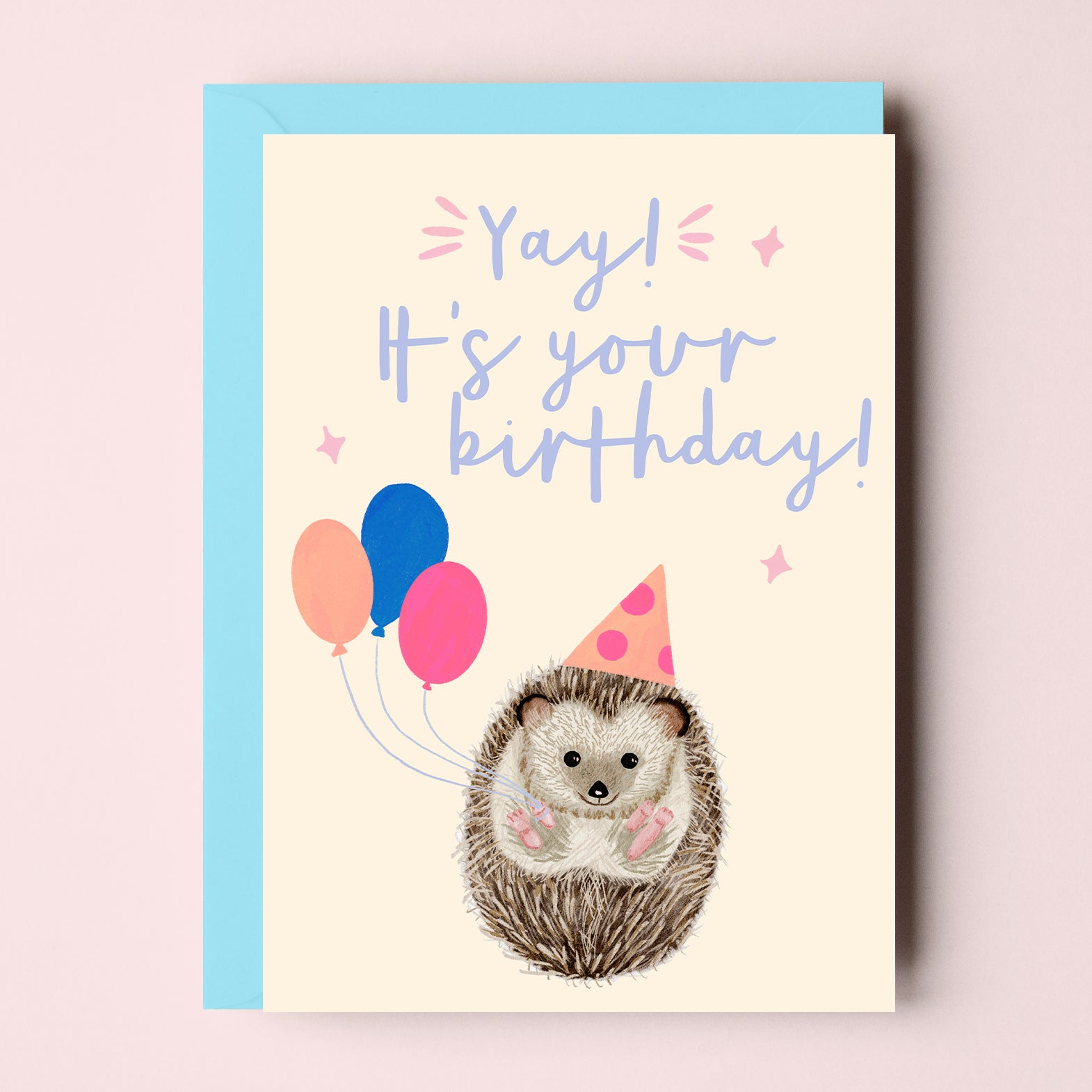 This adorable birthday card features a cute hedgehog holding colorful balloons, perfect for wishing someone a happy birthday. Send some joy and a smile with this playful and quirky card.
