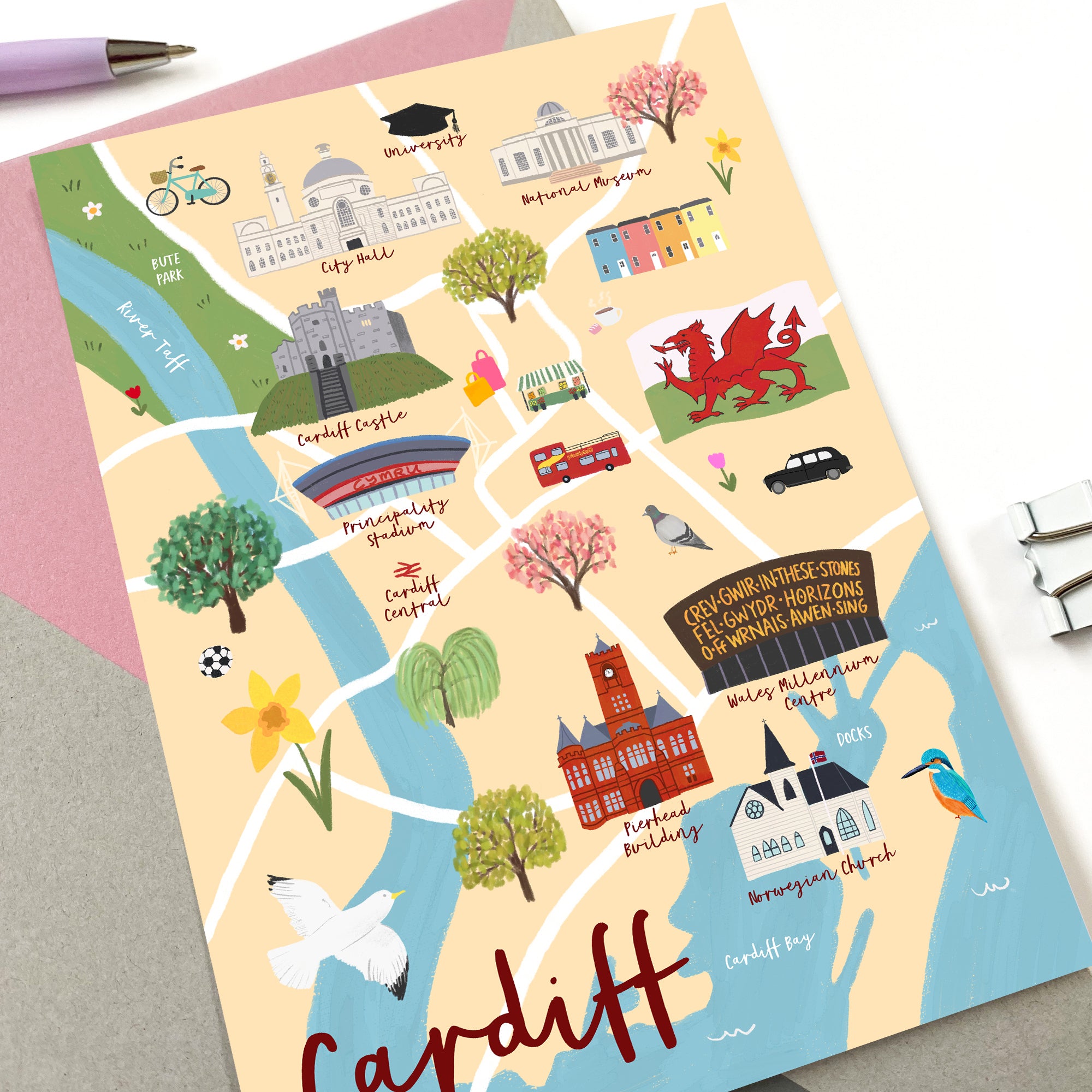 Postcard featuring my illustrated map of Cardiff in Wales.