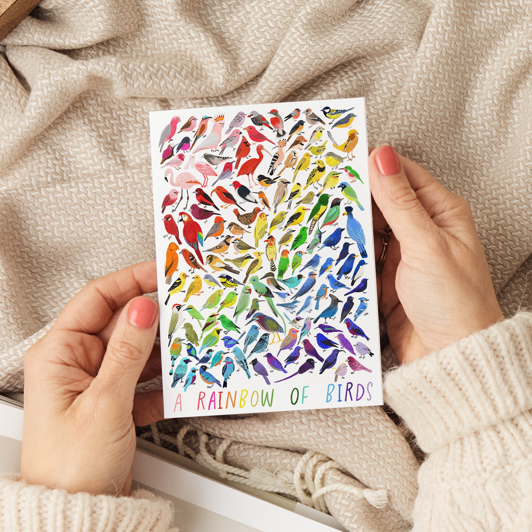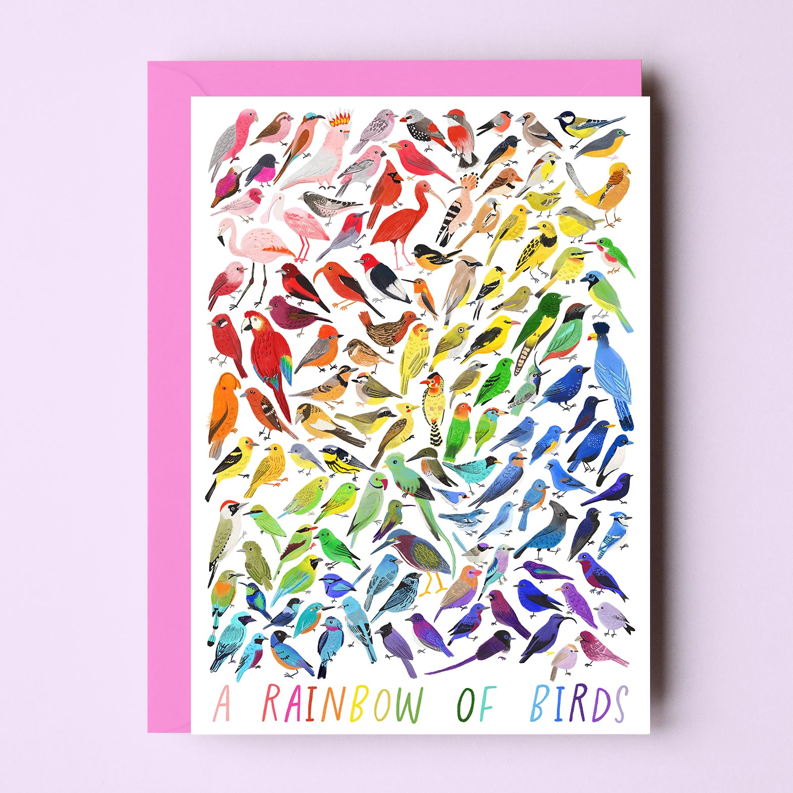 A card featuring my bird rainbow illustration which contains 100+ colourful birds from around the world.